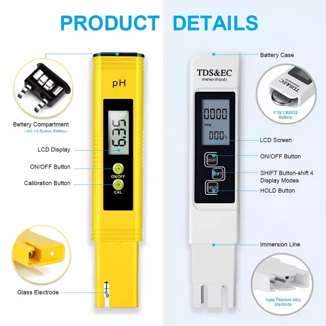 This high-performance tester measures pH (0-14 range), TDS (0-9990 ppm), and EC (0-9990 µs/cm) with exceptional accuracy of ±2%. Equipped with an auto temperature compensation function, it delivers consistent results in temperatures from 32°F to 176°F. The clear digital LCD display ensures quick readability, while the lightweight, handheld design and protective case make it perfect for both home and professional use.